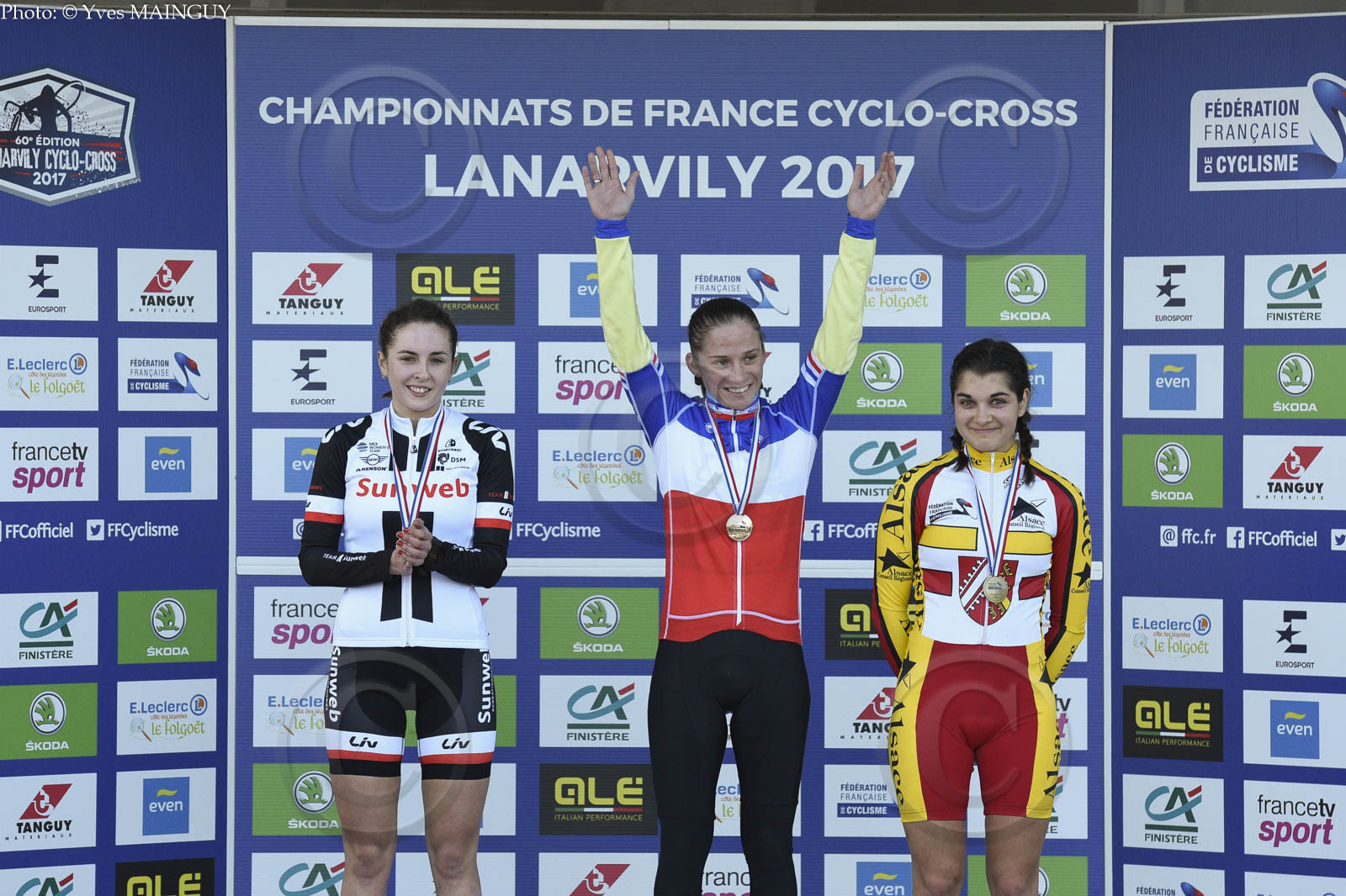 | Description | Podium, G/D: Juliette Labous (2� / Franche Comte), Caroline Mani (1� / Franche - Comte), Helene Clauzel (3� / Alsace). Course Dames. CHAMPIONNAT DE FRANCE DE CYCLO-CROSS 2017. Lanarvily (29), le dimanche 08 janvier 2017. Photos: � Yves MAINGUY |