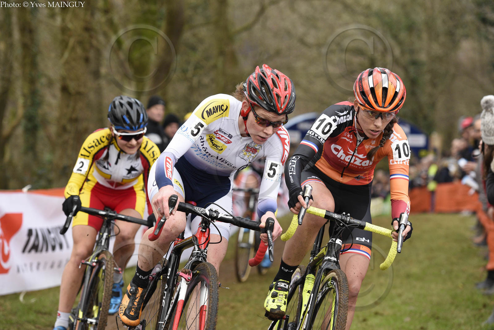G/D: Helene Clauzel (3� / Alsace), Marlene Petit (5�), Lucie Chainel (4�). Course Dames. CHAMPIONNAT DE FRANCE DE CYCLO-CROSS 2017. Lanarvily (29), le dimanche 08 janvier 2017. Photos: � Yves MAINGUY